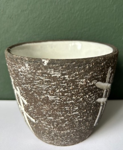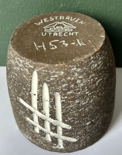 OverzichtWestraven chanoir bloempotje uit de jaren vijftig uitgevoerd met een wit lijndecor.