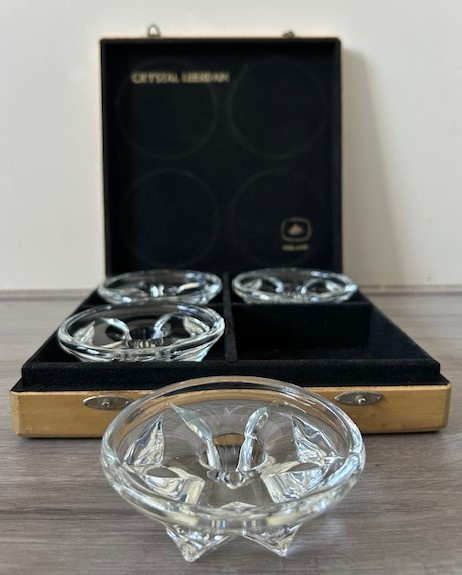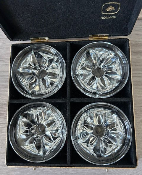 OverzichtCrystal Leerdam luxe houten cassette inclusief vier Ster kandelaars van ontwerper Floris Meydam.