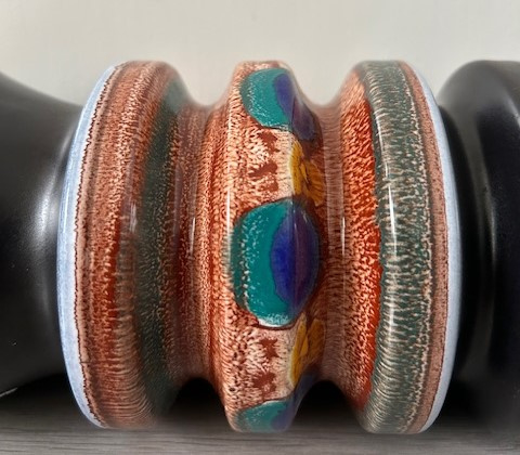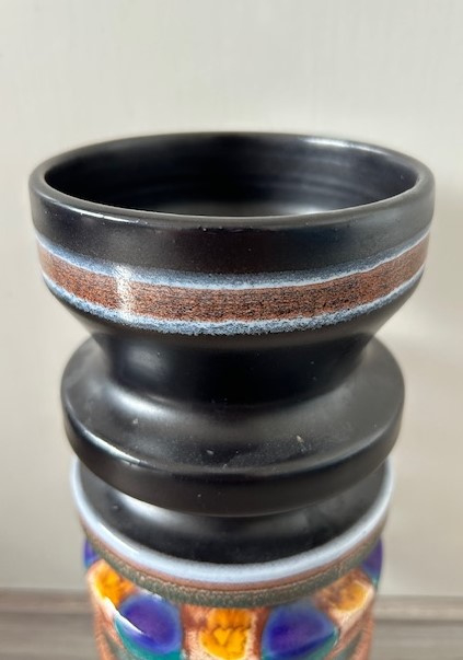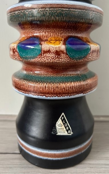 Flora hoge plateel vaas met decor 'Nora' uit de jaren zeventig. De mat zwarte vaas is gedecoreerd met blauw/groene 'pauwenogen'.