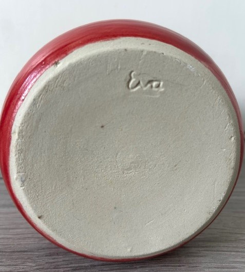 OverzichtHandgedraaide vaas, getrapt model, in helder rood glazuur. De vaas van witbakkende klei is voorzien van een smalle opening en ingekerfde decoratie.