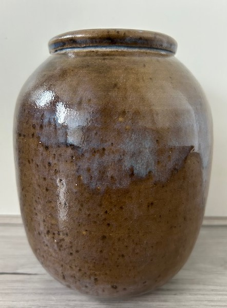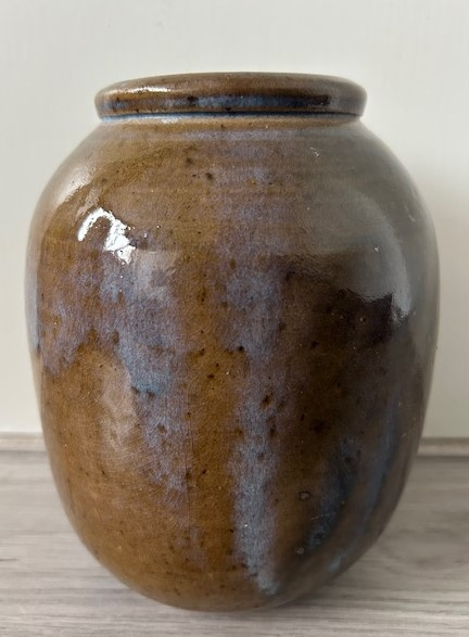 OverzichtTonvormige handgedraade vaas in stevig keramiek. De vaas is bedekt met mosgroen en blauw (druip)glazuur.