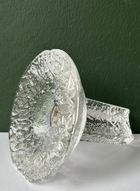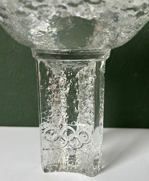 OverzichtOrrefors 'Olympic Torch' kandelaar van persglas. Op een van de drie zijden zijn de vijf Olympische ringen in reliëf afgebeeld. De bovenkant is gemaakt van getextueerd glas lijkend op ijs. Een ontwerp van Lars Hellsten voor de Olympische winterspelen van 1984 in Sarajevo. De kandelaar is geschikt voor een waxinelichtje.