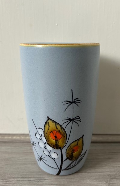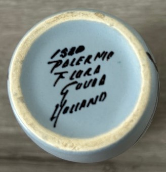OverzichtFlora handgeschilderd lichtblauw vaasje (recht model no. 1580) met decor 'Palermo'.