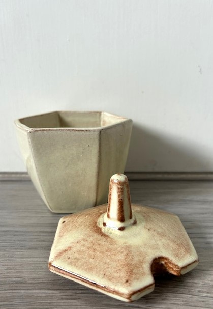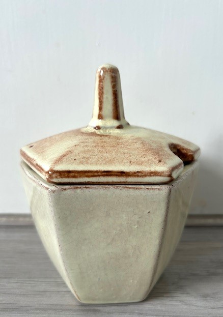 OverzichtMobach zeskantig suikerpotje in Art Deco stijl. Het potje is bedekt met lichtgeel/bruin glazuur.