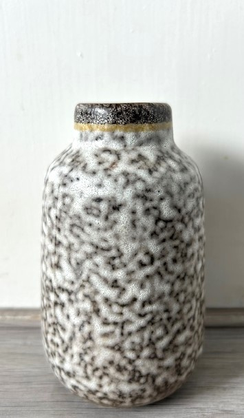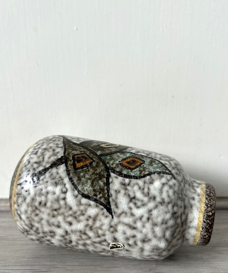 OverzichtFlora handgeschilderd plateel vaasje met decor 'Tanja'. Het wit/bruin geglazuurde vaasje is gedecoreerd met een drietal groene bladeren Er zijn accenten in geel en rood aangebracht.