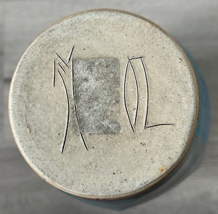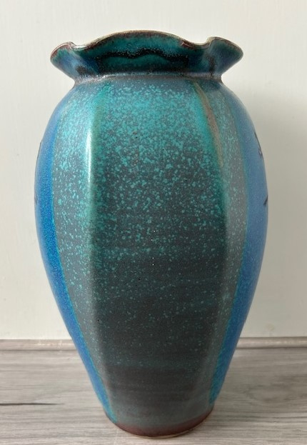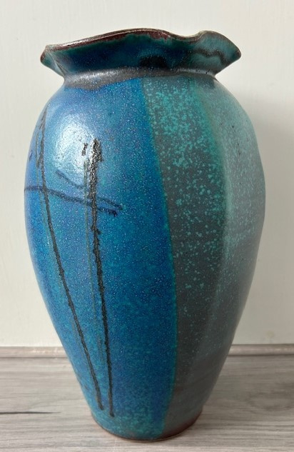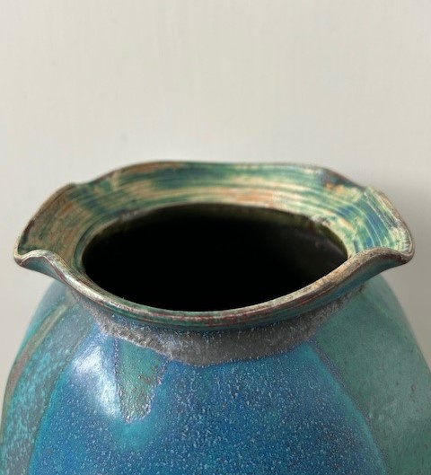 OverzichtEd Meissenberg forse steengoed vaas met een gegolfde kraag. De enigszins hoekige vaas is uitgevoerd met blauw, groen en zwart glazuur.