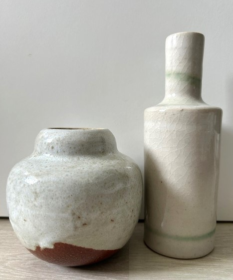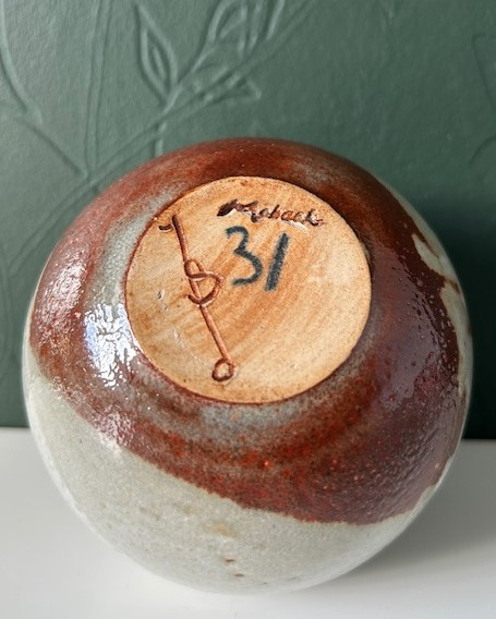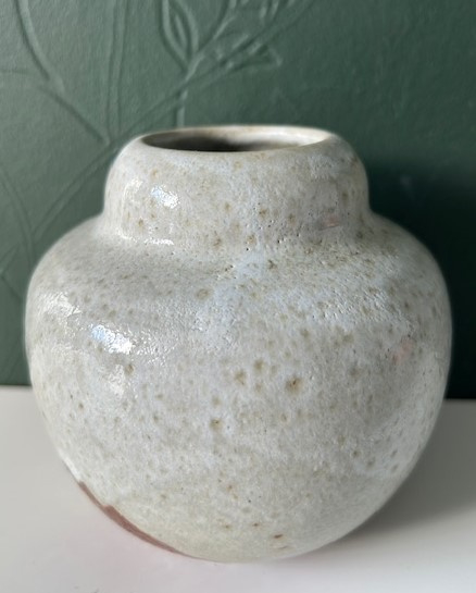 OverzichtMobach handgedraaide vaasje van ontwerpster/draaister Joke Stroes. Het vaasje is bedekt met zachtgroen gevlekt- en roodbruin glazuur.