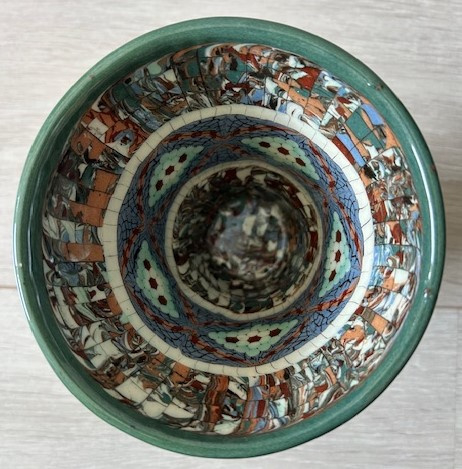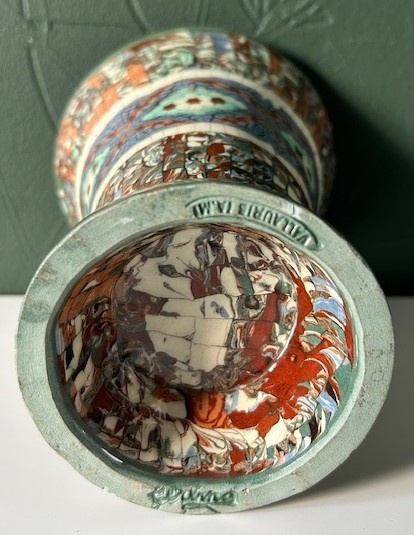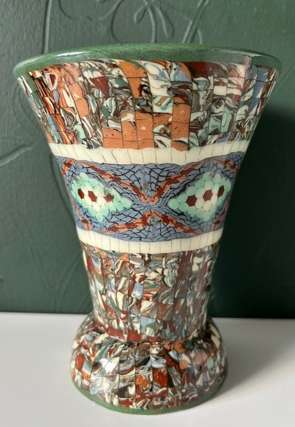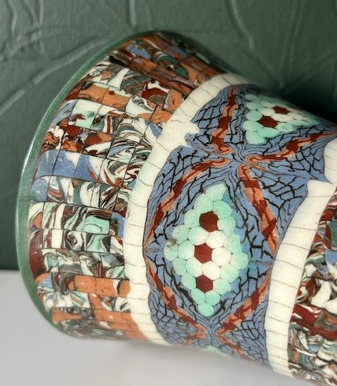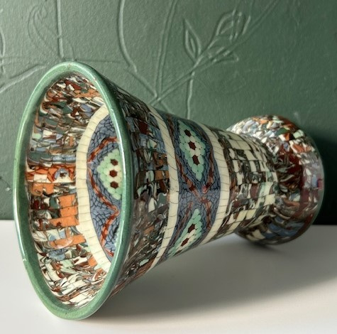 Jean Gerbino (1876-1966) zeldzame mozaïek vaas. De vaas met koepelvormige voet is gemaakt volgens de Nerikomi-techniek (Neriage): dit is een oude Japanse keramische techniek. De trompetvaas is handgevormd en opgebouwd met verschillende gekleurde kleisoorten. Na het bakproces worden het aardewerk spiegelglad gepolijst en doorschijnend geglazuurd. Jean Gerbino werkte 15 jaar lang met veel toewijding om zijn eigen unieke techniek te ontwikkelen. In 1931 won hij de 'Paris Concours Lépine prize' voor zijn uitzonderlijke- en fraaie werk.