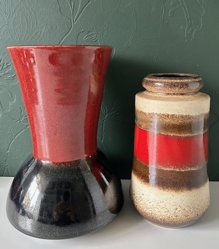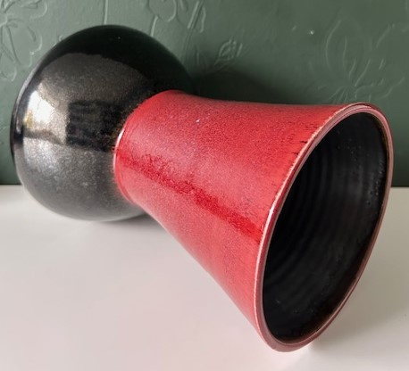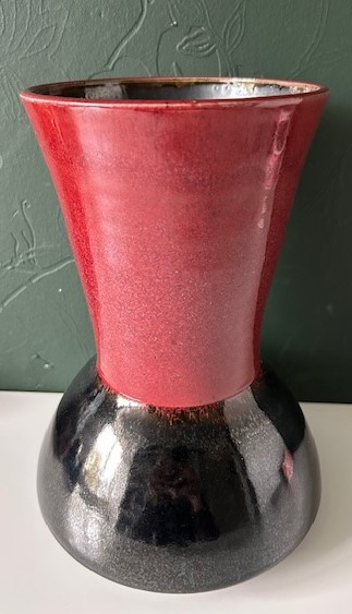 OverzichtEd Meissenberg grote trechtervormige steengoed vaas. Het bovenste deel is donkerrood geglazuurd, het onderste deel is antraciet van kleur. Een praktische- en stabiele vaas voor een groot boeket. Ed en Jette Meissenberg hebben onder de naam JET Keramiek een winkel in de Vughterstraat in Den Bosch, met een open atelier. Ed richt zich naast het draaien ook op de vrije vormgeving, zoals objecten, gezichten en dierfiguren. Jette heeft zich toegelegd op het glazuren.