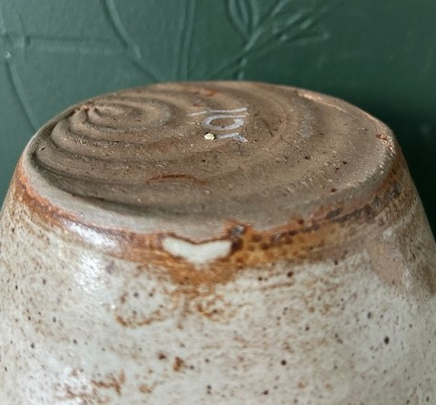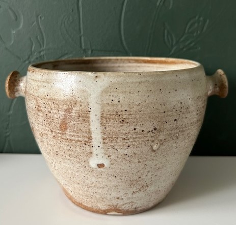 OverzichtDun gedraaide steengoed bloempot, lichtbruin met crèmekleurig druipglazuur. De pot is voorzien van twee kleine ronde oren.