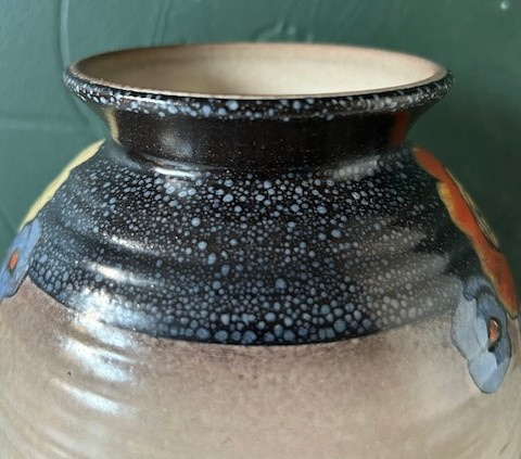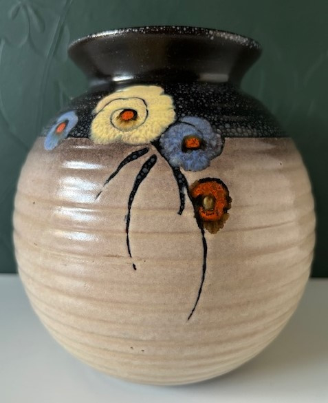 OverzichtSchoonhoven beige/bruine plateelvaas met polychroom bloemdecor. De bolvaas, model no. 898, is vervaardigd rond 1935.