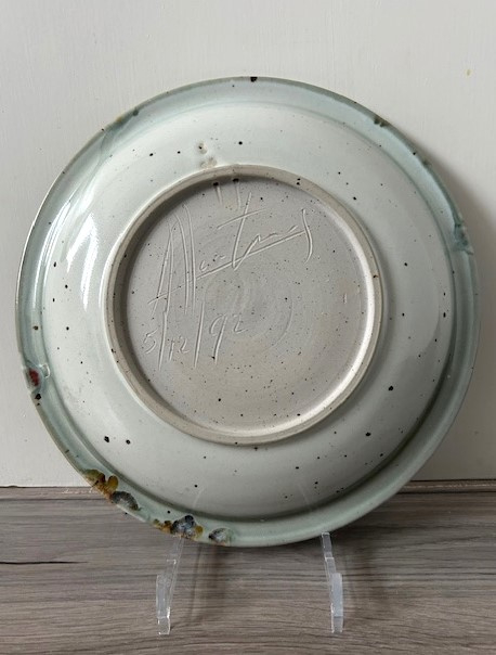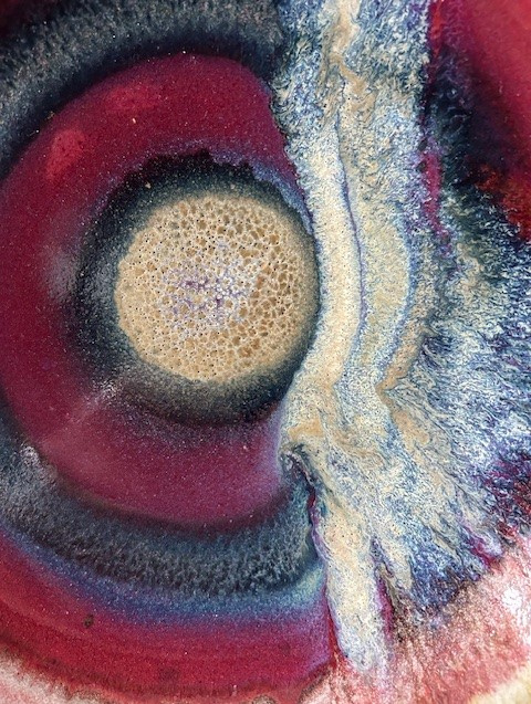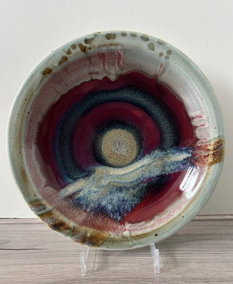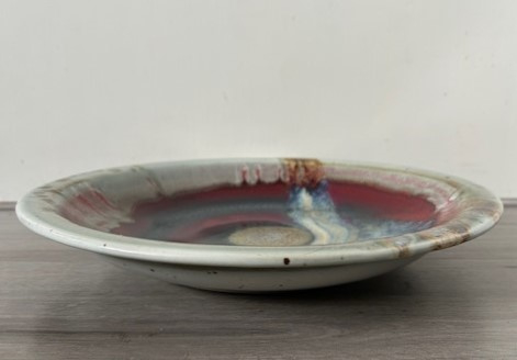 OverzichtLeo Martens grote handgedraaide wandschotel (steengoed). De schotel/schaal is bedekt met rood-blauw-paars sang de boeuf glazuur en splashes in wit en groen.