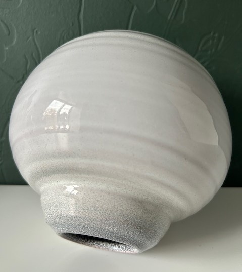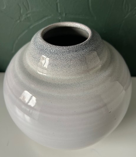 OverzichtSchoonhoven plateel bolvaas (model no. 662) van roodbakkende klei. De vaas is uitgevoerd met wit- en grijsblauw gespikkeld glazuur (batiktechniek).