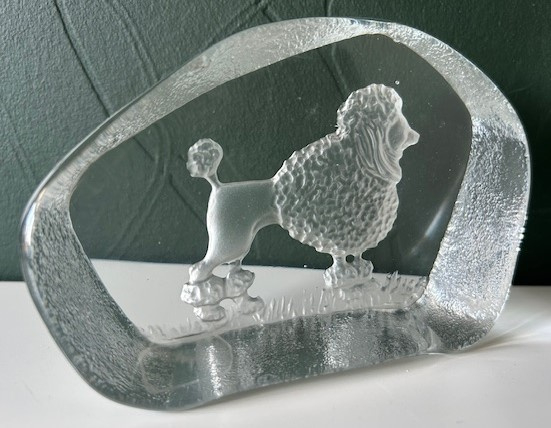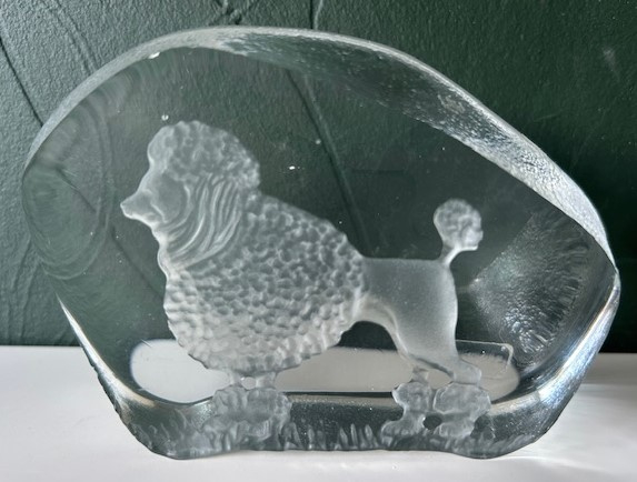 OverzichtNybro Sweden handgemaakte presse papier (full lead crystal) met een afbeelding van een poedel hond.