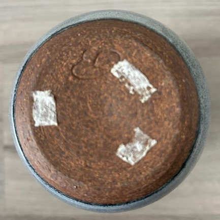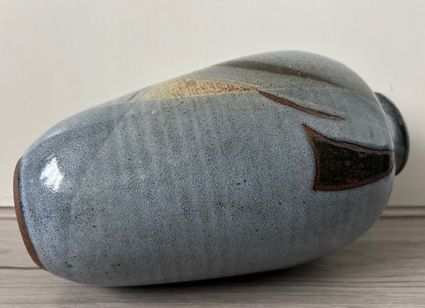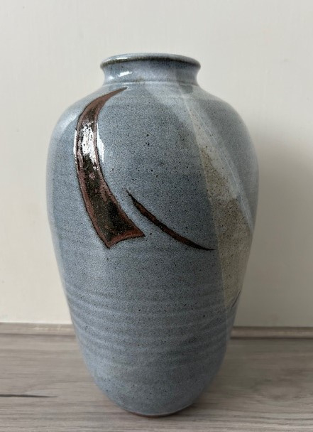 OverzichtRanke blauw geglazuurde steengoed vaas uitgevoerd met een abstract decor in wit en groenbruin.