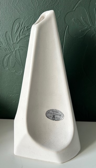 OverzichtFlora strak vormgegeven symmetrische plateel vaas uit de jaren tachtig. De elegante design vaas is geschikt voor enkele bloemen of een tak. Gemerkt met de originele zilveren Flora sticker.