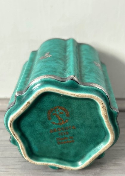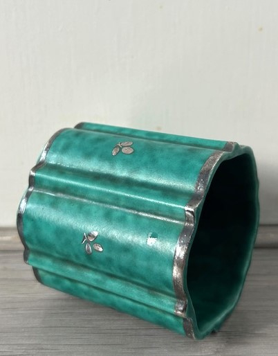 OverzichtGustavsberg 'Argenta' bekervaasje in groen gemarmerd glazuur. Het vaasje met geschulpte rand is versiert met zilveren klaverblad decoratie. De Argenta-serie werd geproduceerd tussen 1930 en de jaren zeventig.