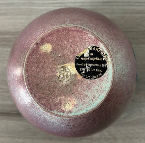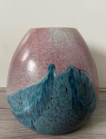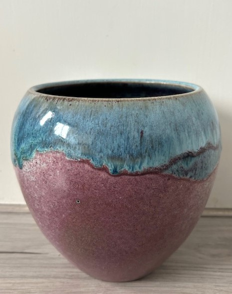 OverzichtPottenbakkerij in Kannen en Kruiken handgedraaide bloempot van stevig keramiek. De pot in oudroze is bedekt met een dikke laag blauw/groen druipglazuur.