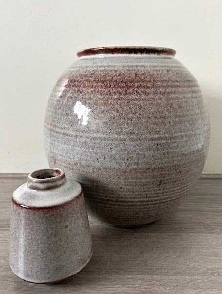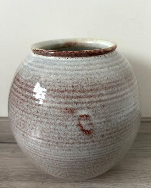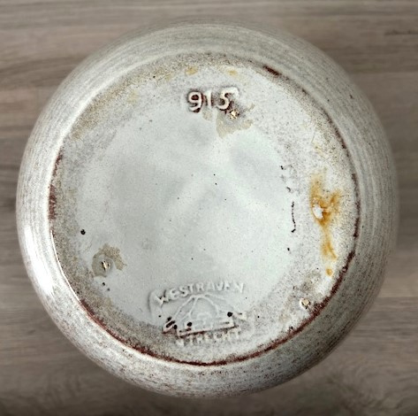 OverzichtWestraven forse handgedraaide bolvaas, model no. 915, uit de jaren vijftig. De vaas is bedekt met een gemeleerd grijs-bruin glazuur.