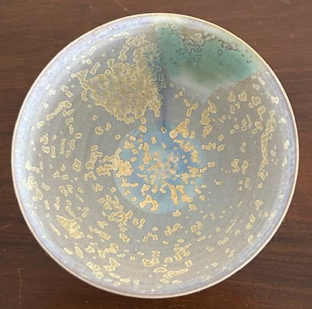 OverzichtChawan 'Sakura' (Japanse theekom) uitgevoerd met micro-kristalglazuur in tinten groen, blauw en roze-rood. De moderne kom is strak en zeer dun gedraaid.