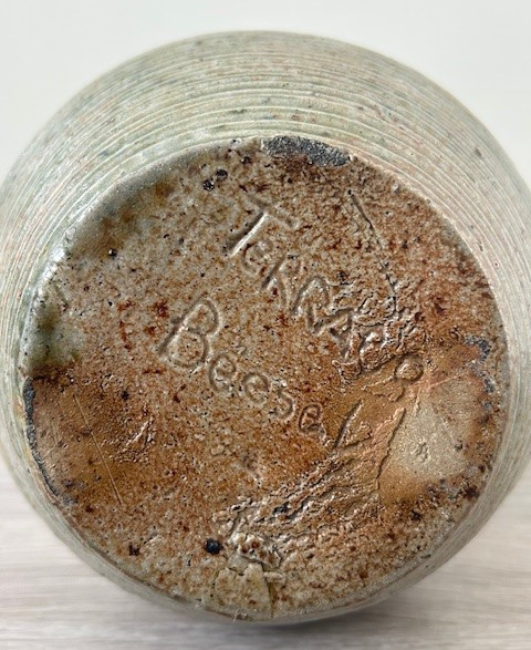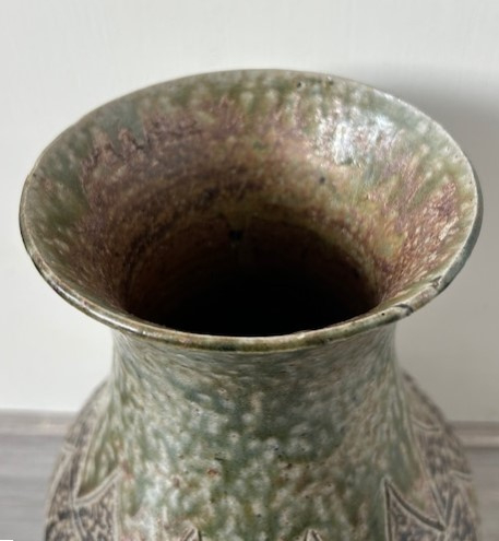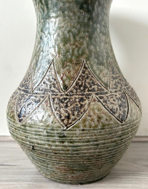 St. Joris (terraco) Beesel vaas uitgevoerd met groen- en bruin zoutglazuur. De steengoed vaas heeft een wijduitlopende hals. Praktisch model voor bloemen.