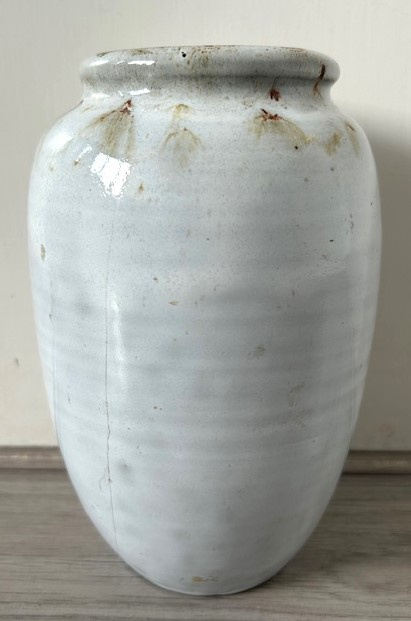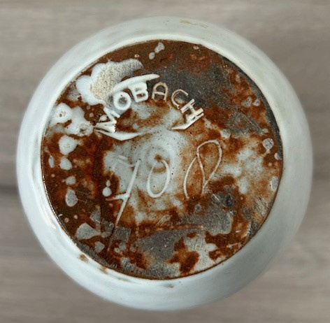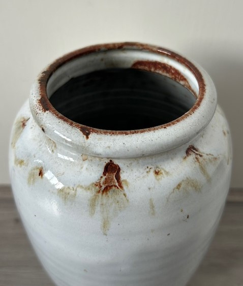 OverzichtMobach handgedraaide vaas in wit- en bruin glazuur uit de jaren vijftig.