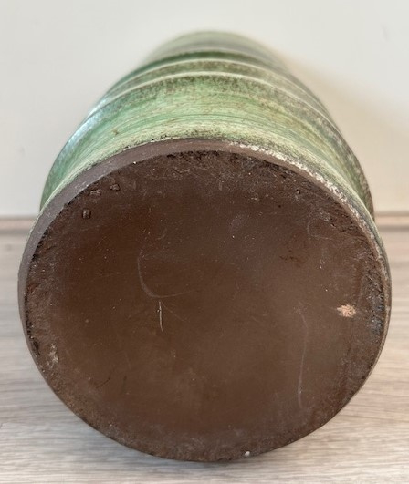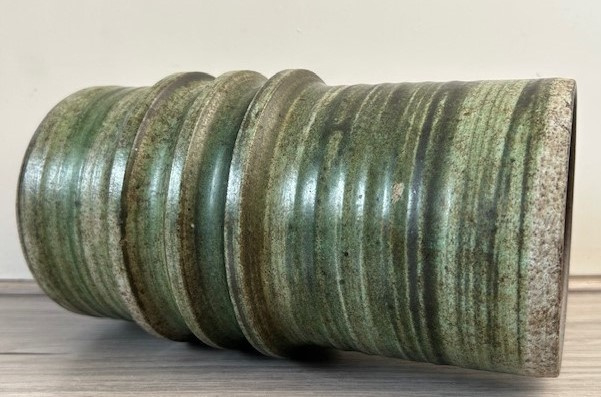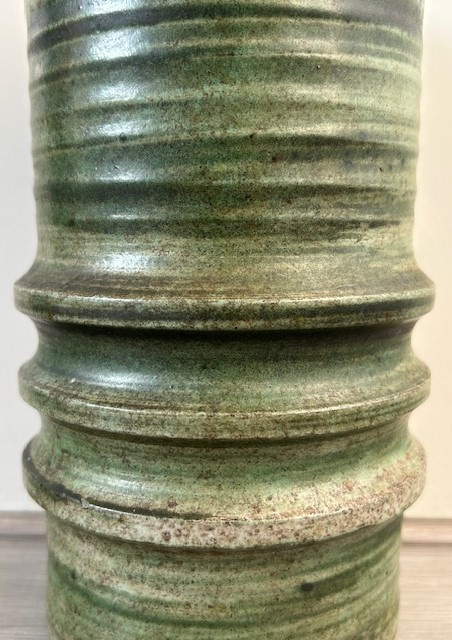 OverzichtHandgedraaide cilindervaas met horizontale ringen. De vaas is uitgevoerd in (licht)groen en grijs glazuur.