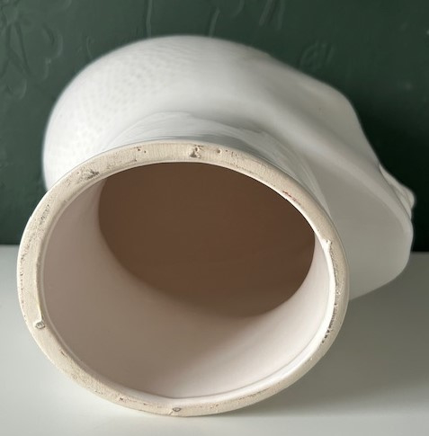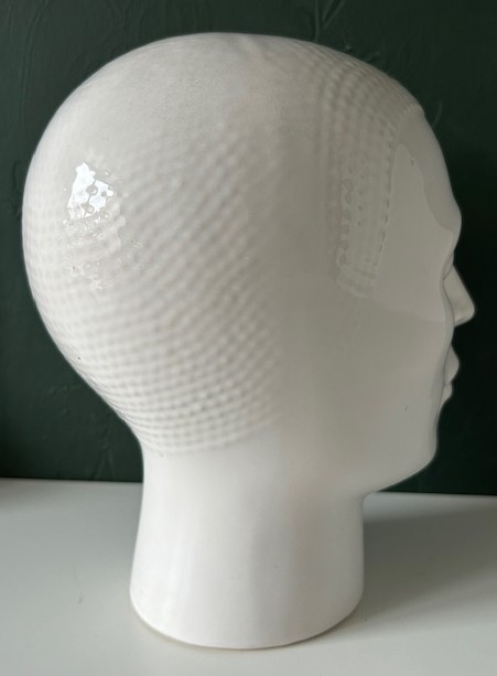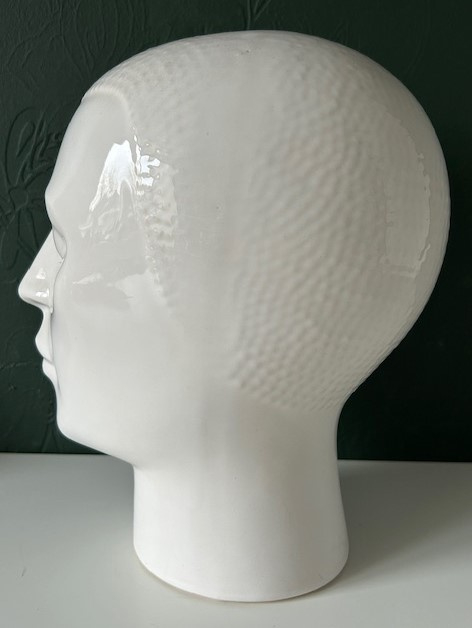 OverzichtRoyal Delft wit geglazuurd aardewerk hoofd uit de jaren zeventig. Deze hoofden werden gebruikt als mannequin voor een hoed of koptelefoon. Mooie tijdloze uitvoering.