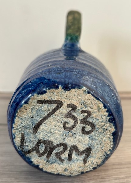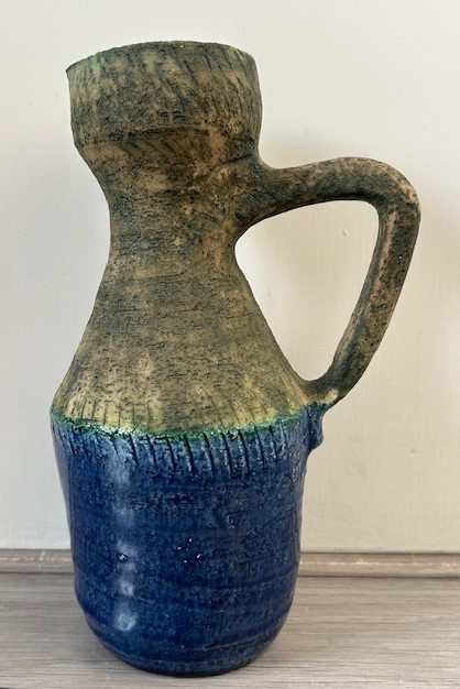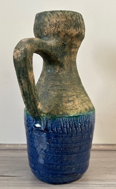 OverzichtHandgedraaide oorvaas (deels) uitgevoerd in travertijn. Het onderste deel van de vaas is blauw geglazuurd.