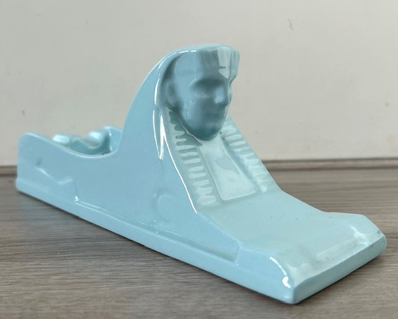 OverzichtPetrus Regout langwerpige asbak in de vorm van een gestileerde Sfinx. De pastelblauwe asbak in Art-Deco stijl is een ontwerp van de Maastrichtse beeldhouwer Charles Vos (1888-1954) uit circa 1930. Deze asbak stamt uit de jaren vijftig/zestig.