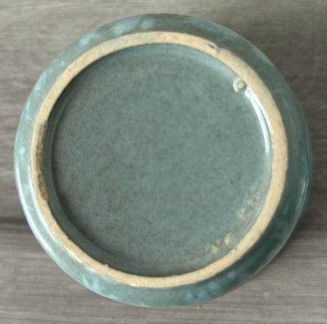 OverzichtGeribbeld bloempotje met mintgroen gewolkt glazuur. Medium maat circa 8,5x10 cm in een serie van drie bloempotjes (zie foto).