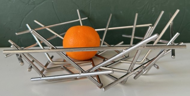 Overzicht'Blow Up' fruitschaal van Alessi, ontworpen door ontwerpduo en broers Humberto en Fernando Campana. Deze fruitschaal bestaat uit aan elkaar gelaste roestvrijstalen staven en heeft daardoor een modern en industrieel uiterlijk.