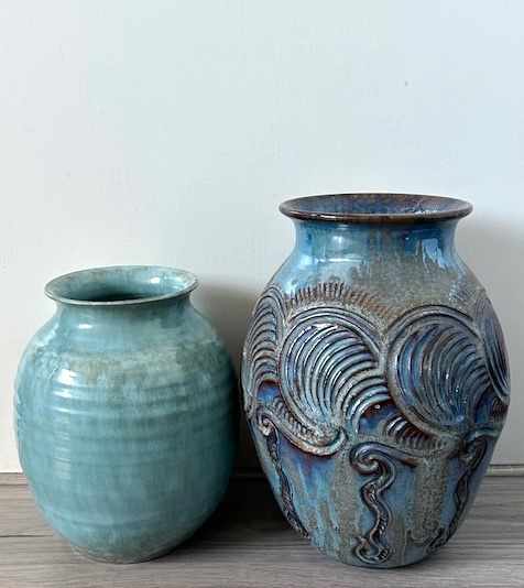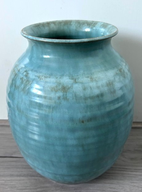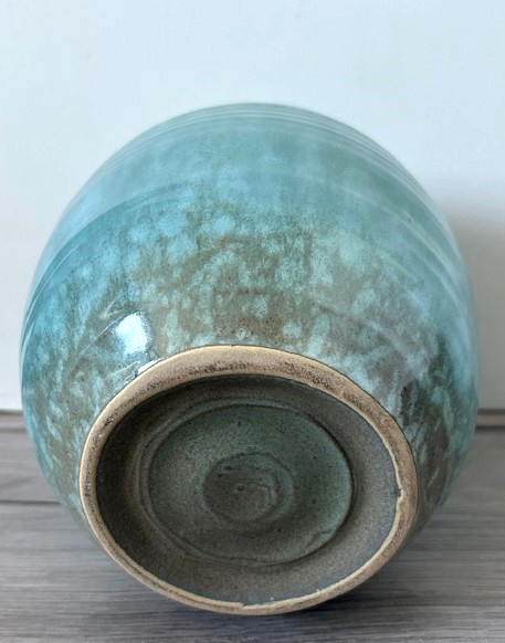 OverzichtDe Sphinx middelgrote handgedraaide vaas uit de jaren vijftig. De vaas is bedekt met lichtgroen/bruin gewolkt glazuur.
