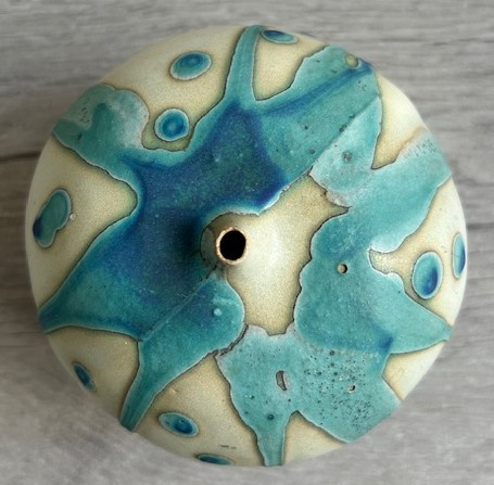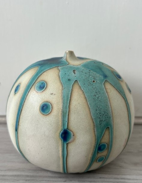 OverzichtCastlecove Pottery handgevormde steengoed bol uitgevoerd met turquoise en kobaltblauw druipglazuur. De bol is voorzien van een subtiel halsje.