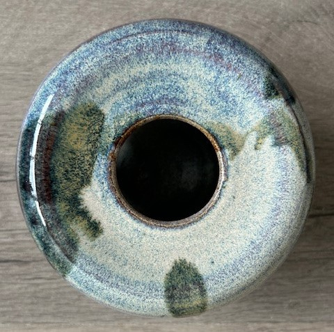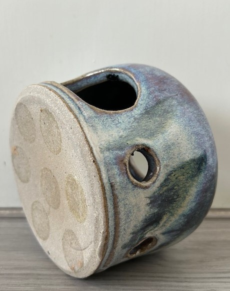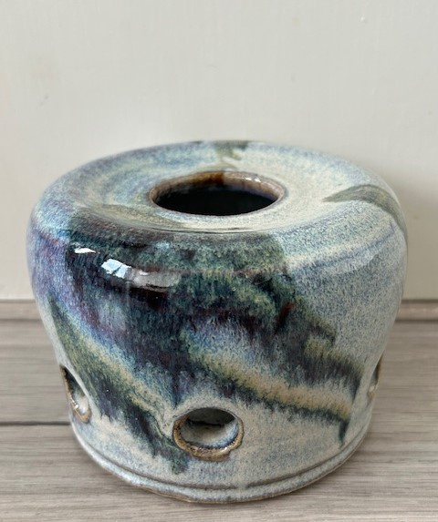 OverzichtSteengoed rechaud uitgevoerd met fraai glazuur in blauw-groen-lila tinten. In de rechaud kan een waxinelichtje geplaatst worden voor het warm houden van bijvoorbeeld een thee- of koffiepot.