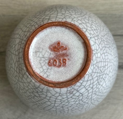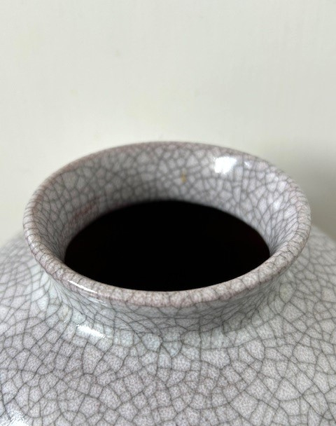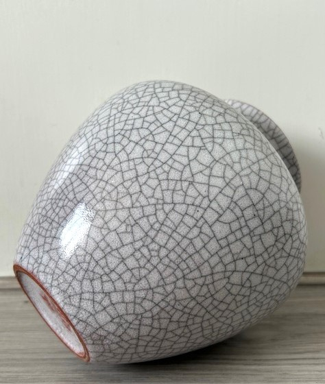 OverzichtKarlsruhe Majolika (zeldzame) vaas uitgevoerd in grijs craquelé glazuur met een zweem van roze. Die Karlsruhe Majolika-Manufaktur maakt sinds 1901 kunstzinnig keramiek voor de bovenlaag van de markt. Deze vaas stamt uit de tweede helft van de jaren vijftig en is ontworpen door Friedgart Glatzle.