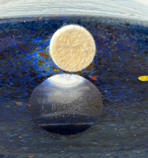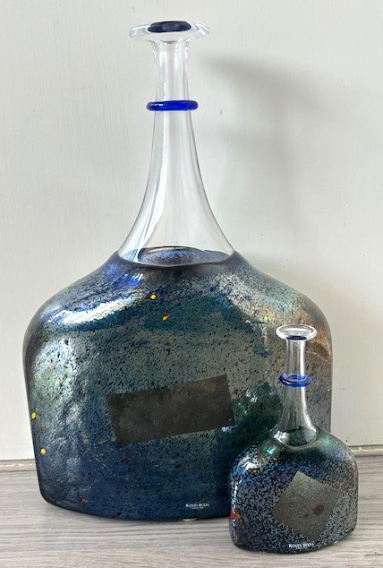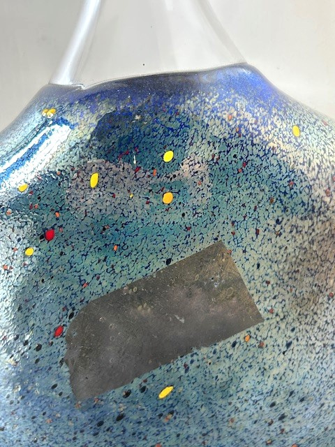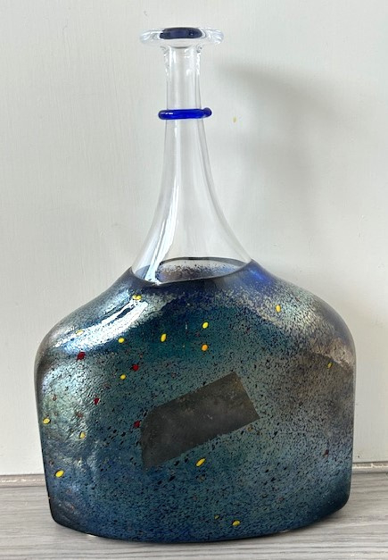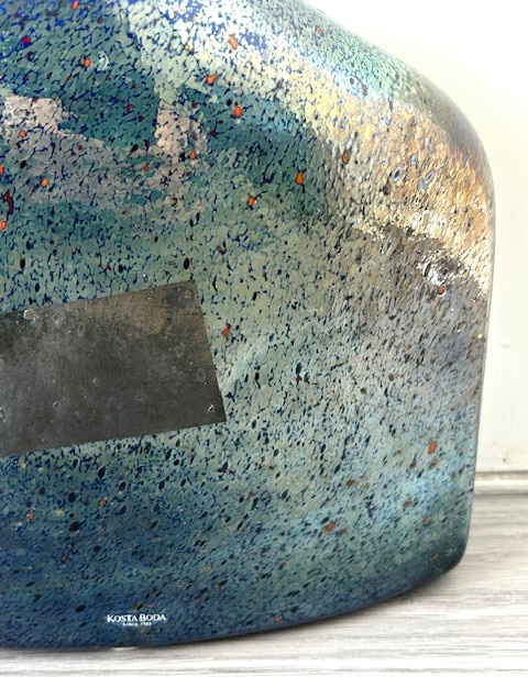 OverzichtKosta Boda flesvaas uit de Satellite-serie (grootste maat ca. 38x24 cm) van ontwerper Bertil Vallien uit circa 1980. Handgemaakt en op de onderkant gesigneerd door de kunstenaar. De buitenkant van de vaas is vervaardigd met behulp van de geavenceerde glasiridescentietechniek, waarbij een dunne metaalachtige laag met regenboogachtige patronen op het glas wordt gefuseerd. De flesvaas is vervaardigd als onderdeel van een gelimiteerde productieserie.