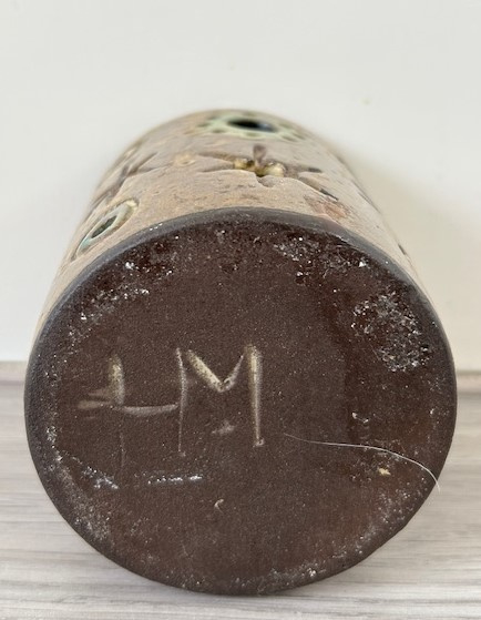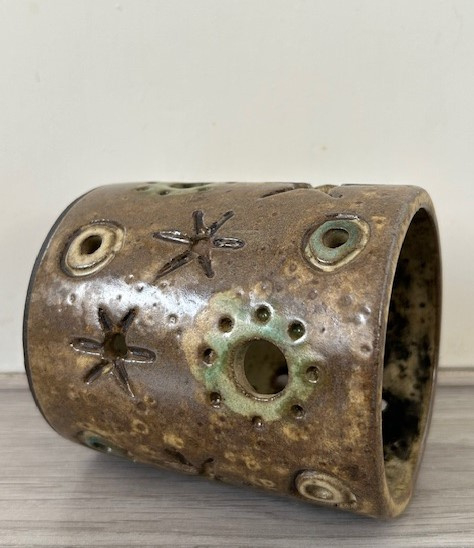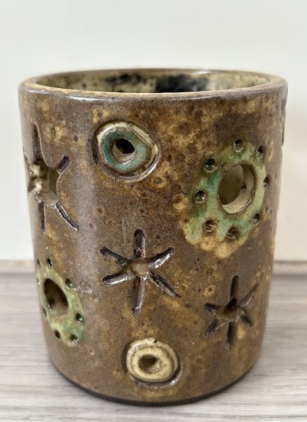 OverzichtHannie Mein bruin geglazuurde waxinehouder met kleuraccenten in groen, blauw en beige. Door de ronde uitsparingen kun je het kaarslicht zien schijnen.