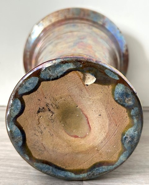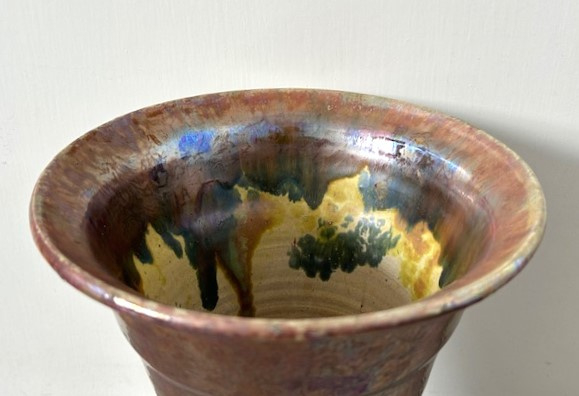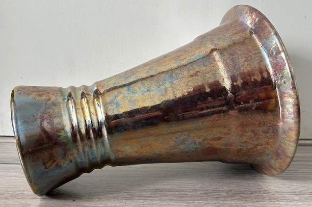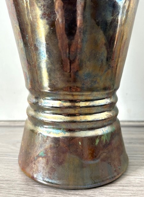 OverzichtKAMO strak vormgegeven vaas in Art Deco stijl. De wijd uitlopende vaas is bedekt met lusterglazuur in tinten goud/brons en groen/blauw. Groot exemplaar gemaakt in de periode 1920-1935.
