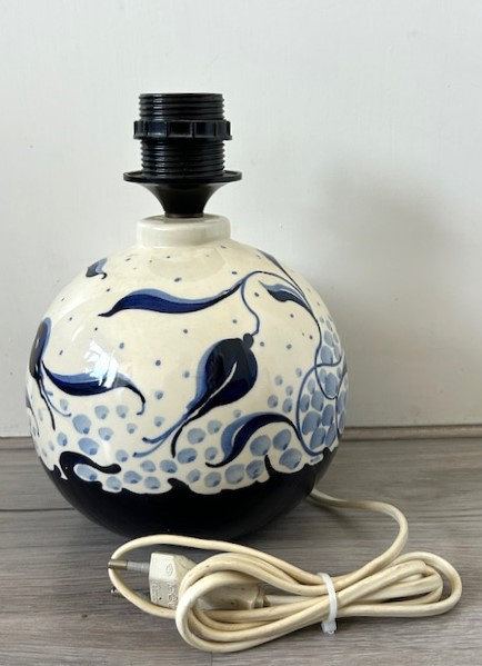 OverzichtPlateelbakkerij Zenith bolvormige plateel lampenvoet. De lampenvoet is uitgevoerd met een sierlijk (handgeschilderd) floraal patroon. Aan de onderkant gemerkt met modelno. 357, initialen van de plateelschilder en Zenith Gouda. De lamp is uitgevoerd met een grote fitting (E27) en een crèmekleurig snoer.