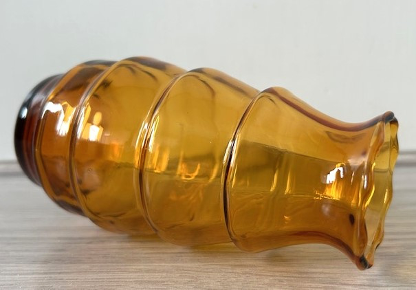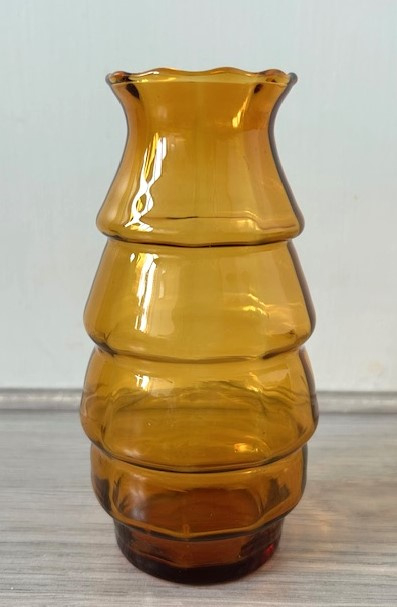 OverzichtVerreries Doyen getrapt ambergeel vaasje in Art Deco stijl. Het optische vaasje heeft een gegolfde bovenrand en stamt uit de jaren dertig.