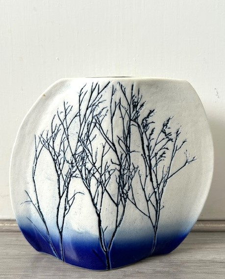 OverzichtTenmoku Pottery ovaal wit geglazuurd vaasje met een smalle opening. Het vaasje is gedecoreerd met twijgjes/takjes. Tenmoku Pottery maakt sinds 1989 kunstzinnig keramiek. De kleuren en texturen zijn geïnspireerd op de natuur.