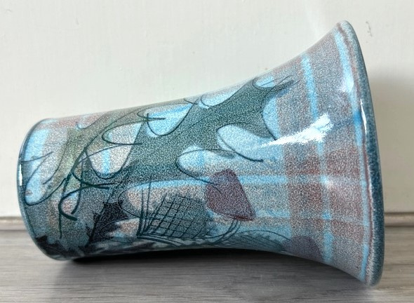 OverzichtThe Tain Pottery steengoed vaasje met een wijd uitlopende bovenkant. Het vaasje in lichtblauw, roze en groen is handgeschilderd met o.a. eikenblad. Tain-aardewerk is op 1280 graden gebakken en daardoor sterk en waterdicht. De gebruikte glazuren zijn gebaseerd op tinglazuur dat voor het eerst werd ontwikkeld in 1978.