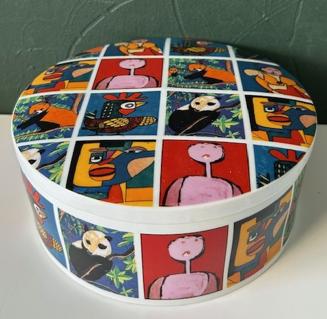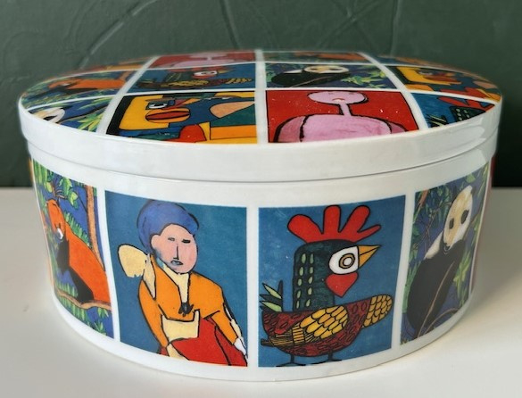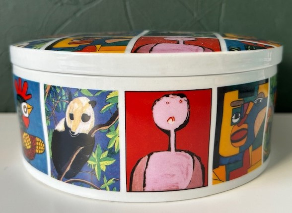 OverzichtKeramische trommel met kunstwerken van figuren en dieren. De kleurrijke trommel is gemaakt door Schoonhoven Keramiek in opdracht van Reinaerde ateliers.
