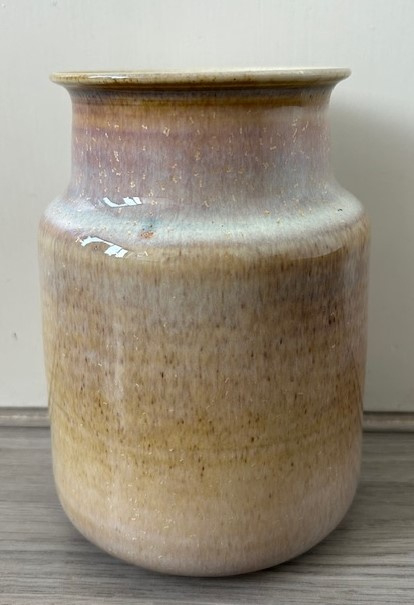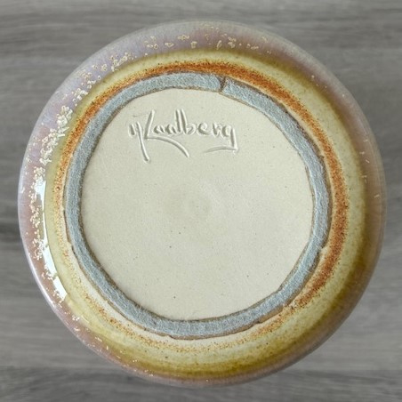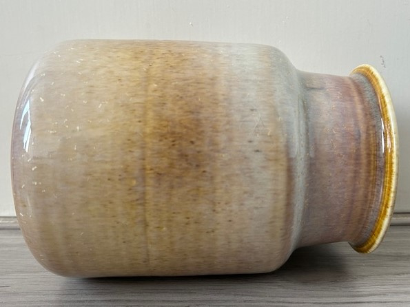 OverzichtHerman jr. Zaalberg praktische handgedraaide vaas. De vaas is bedekt met kristalglazuur in tinten bruin/groen en ijsblauw/roze.