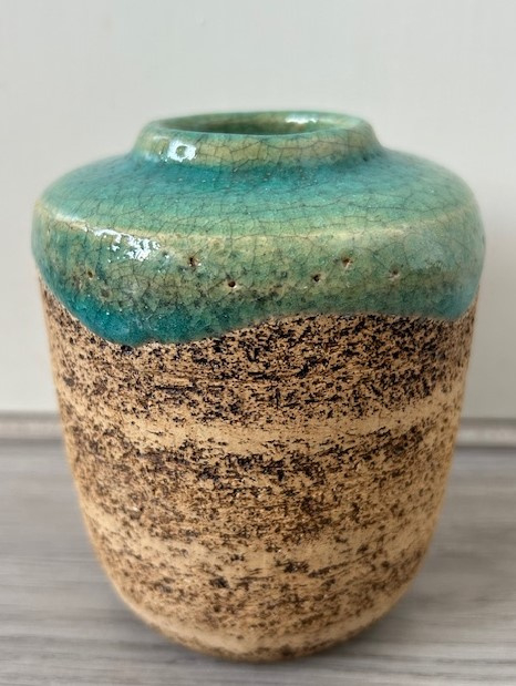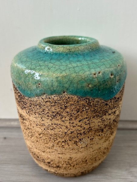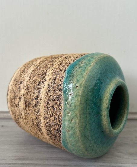Pieter Groeneveldt bandschraap vaasje, aan de bovenkant voorzien van een dik, expressief druipend craquelé glazuur. Kenmerkend voor het bandschraap aardewerk zijn de horizontaal geschraapte banen in het oppervlak van de vazen en potten. Voor het schrapen van het werk werden er metalen strips of bandmetaal gebruikt door de werknemers van de fabriek.