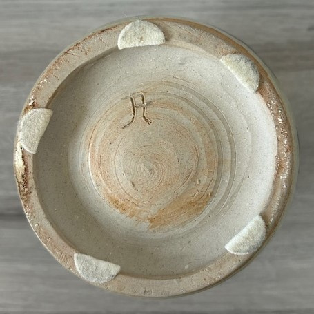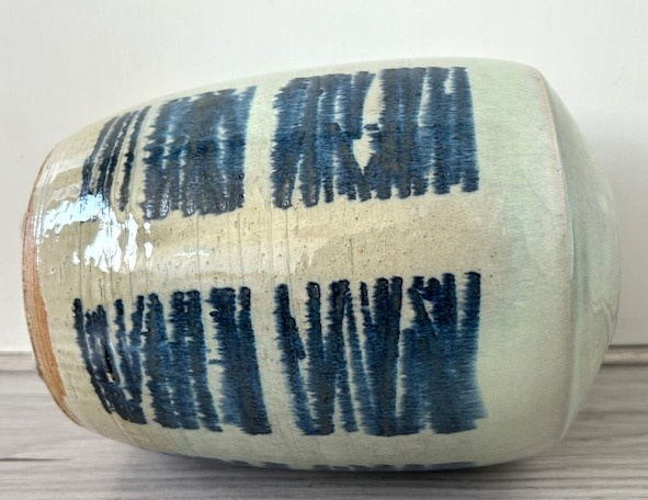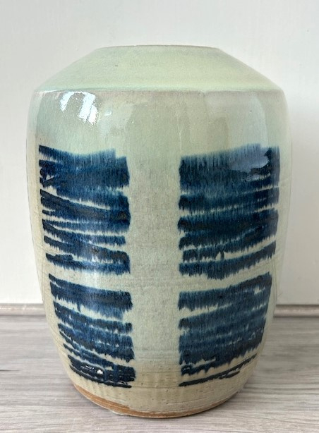 OverzichtTonvormige, lichtgroene studio keramiek vaas. De vaas is gedecoreerd met een horizontaal inktblauw streeppatroon. Op de onderkant gemerkt door de keramist.