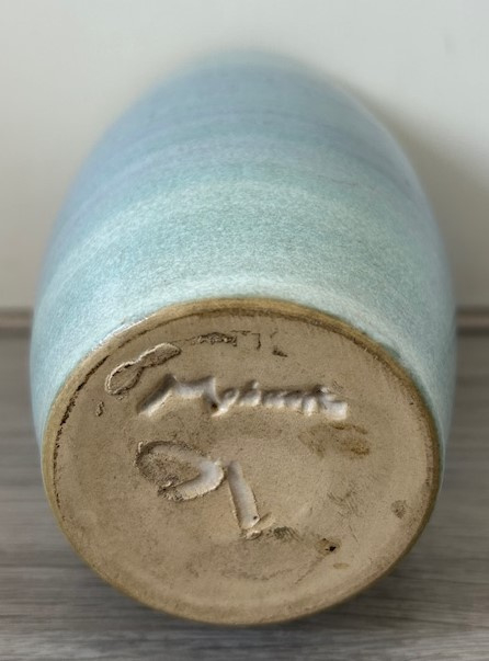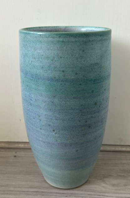 OverzichtMobach smalle vaas uitgevoerd in pastelgroen- en pastelblauw glazuur.