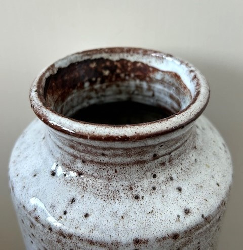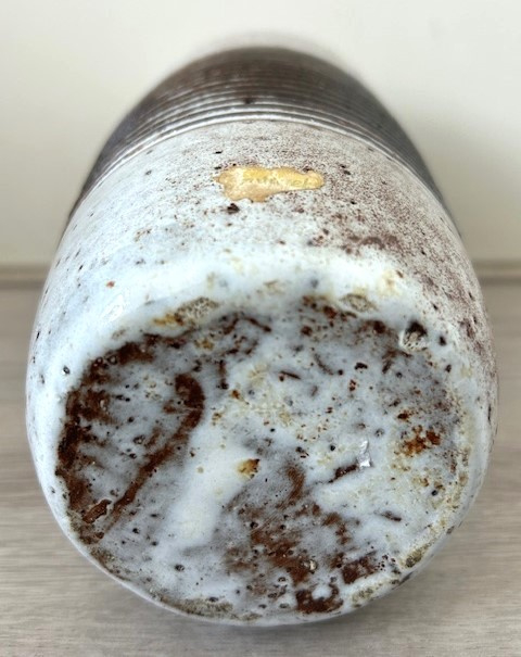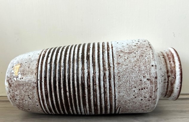 Hoge Westraven vaas in grijsbruin glazuur uitgevoerd met horizontale (draai)ringen. Dit accentueert het ambachtelijke karakter van de vaas.