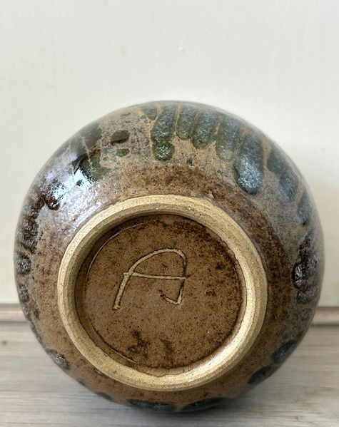 OverzichtBruin geglazuurd steengoed vaasje uitgevoerd met een groen-blauw floraal patroon.